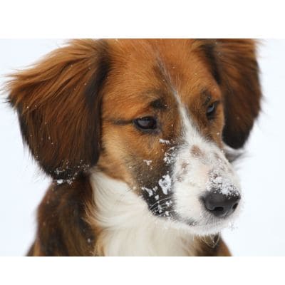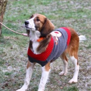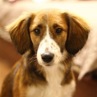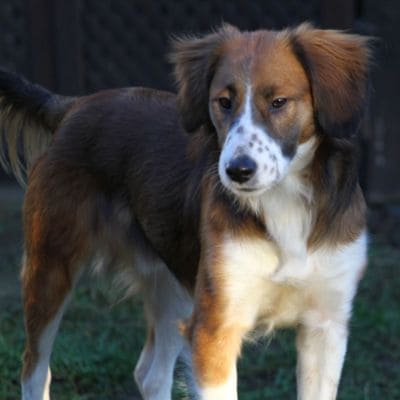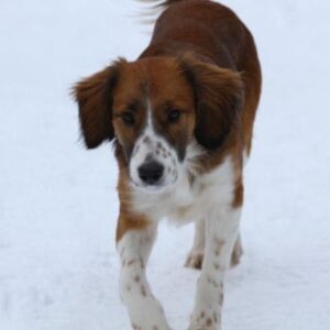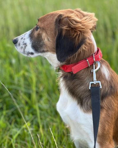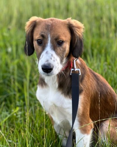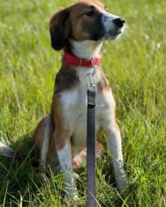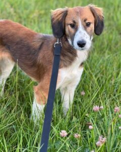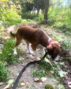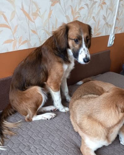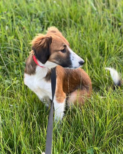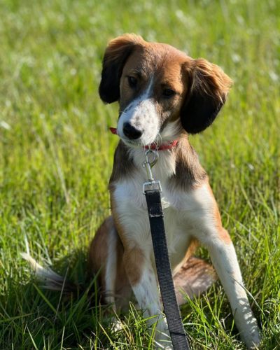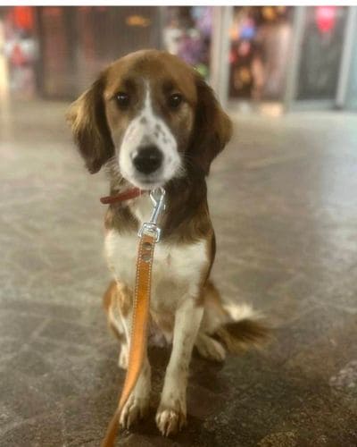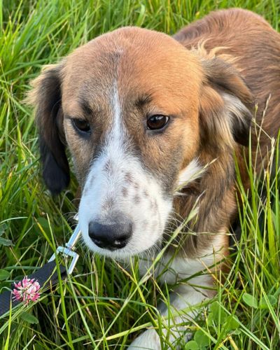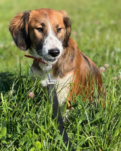 Хорошо ходит на поводке, выгул терпит. Будет среднего размера (по колено).